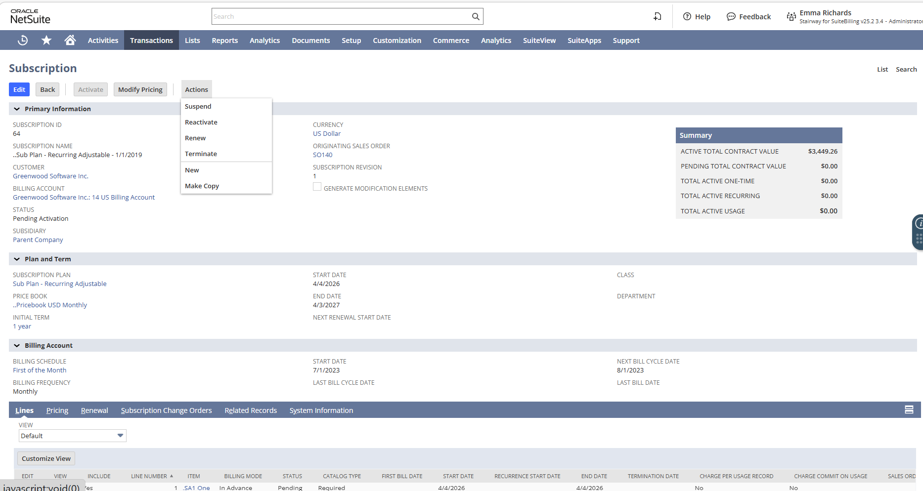 Once enabled, NetSuite shifts from transaction-based recurring billing to subscription-based billing. The subscription record becomes the anchor for pricing, contract terms, billing frequency, and renewal behavior. Rather than managing recurring invoices individually, organizations manage the subscription itself, allowing the system to generate billing activity automatically based on the configuration defined within the subscription structure.
