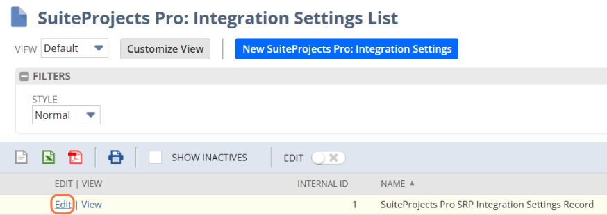 1. The SuiteProjects Pro: Integration Settings record list appears and should include one record only (SuiteProjects Pro Integration Settings Record).Click Edit for the record SuiteProjects Pro Integration Settings Record.