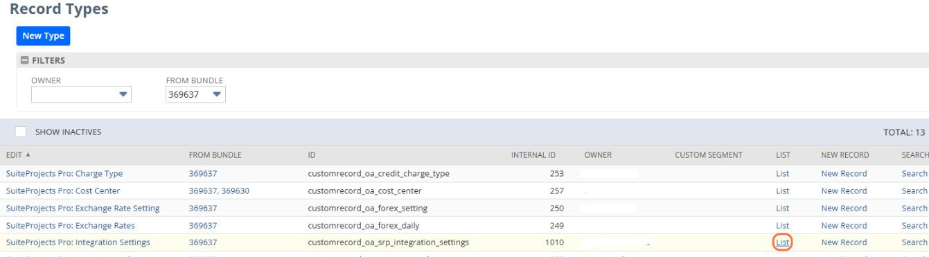 1. Click List for the custom record type SuiteProjects Pro: Integration Settings from bundle 369637